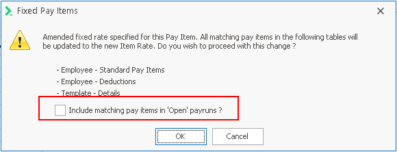 If the Fixed Rate Item checkbox is switched on then an Item Rate must be specified. If changes are made to the Item rate, the system will pop up a confirmation screen as shown below. If you select OK, Ready Pay will process each of the tables referred to, changing the existing rate to the new rate. If you have an open payrun tick the box to enure employees in the payrun are also updated to the new rate.