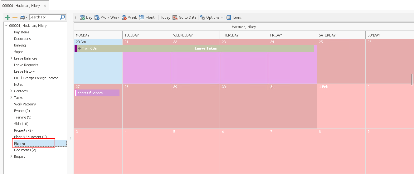 The planner provides an overview of any dated events within hr which relate to this employee.