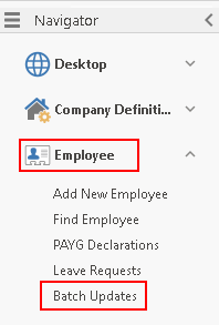Go to Navigator > Employee > Batch Updates to run the Batch Update Wizard.