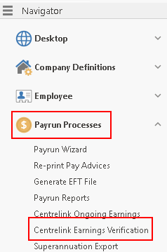- From Navigator select Payrun Processes > Centrelink Earnings Verification.