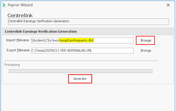 The Payrun wizard will open showing the Centrelink Earning Verification Generation screen. - To specify the Import Filename, click on the Browse button to select the earnings request file which has been provided by Centrelink.