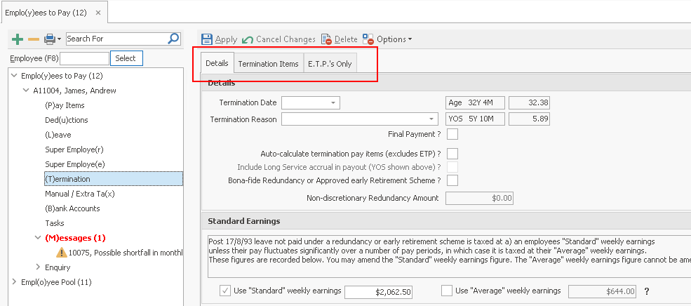 ETP Date If an ETP is being paid for this employee, enter the Date of payment here, this may be a different date to the Termination Date. Click Apply to enable ETP pay items on the Termination Items screen.