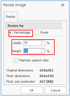 - Generally you would choose to resize by Percentage for example you could resize an image to 75% of its original size.