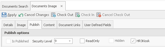 Therefore, if you apply Security level 5 to an image, any user with Security level 5 or above will be able to view the image. - Tick the HR3kiosk check box to enable the document/image to be viewed within Employee Self-Service Kiosk.