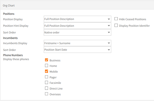 | Sort Order | Select between Native (the order from top level to bottom level of the Org Chart) or by Position Name |
