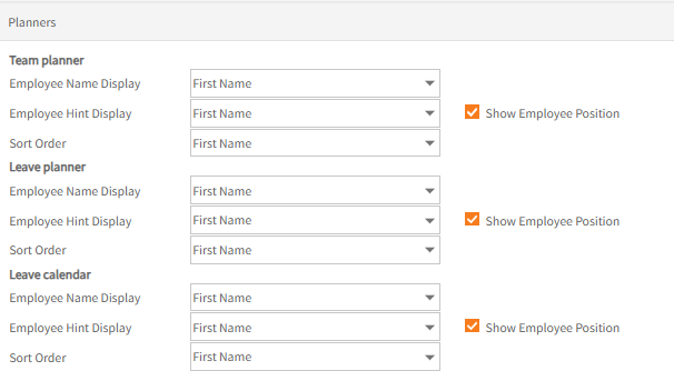 Specify the display options for the Team Planner, Leave Planners and Leave Calendar are displayed for those users who are able to view the planners.
