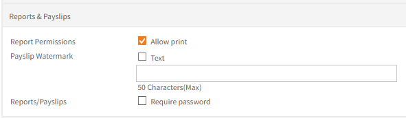 | Payslip Watermark | Allows a text watermark to be entered e.g. a company name or perhaps Printed from Employee Self-Service Kiosk. |