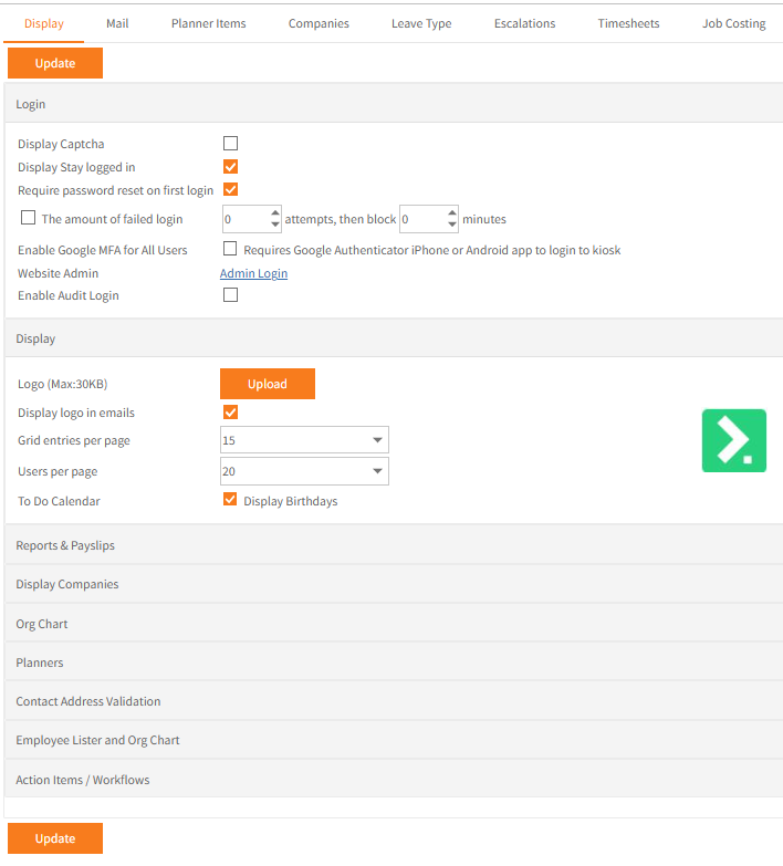 | Display logo in emails | Select this option to include the logo on any emails sent by Employee Self-Service Kiosk. |
