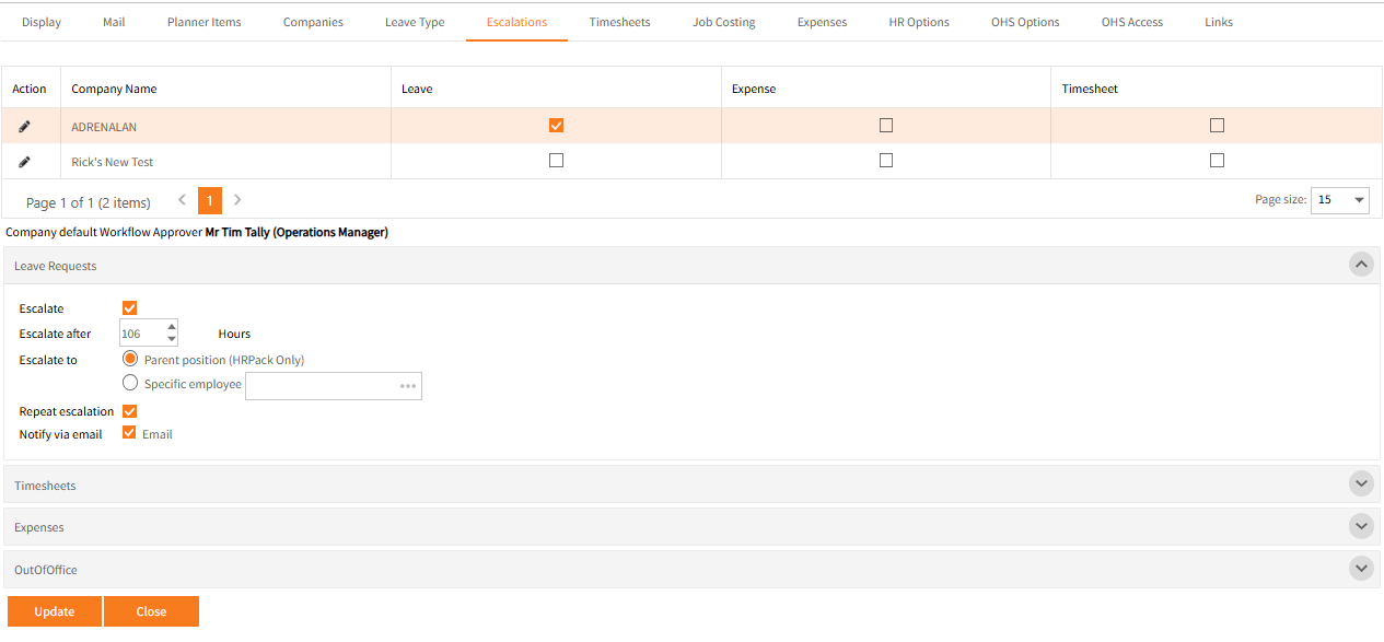 Escalations allows automatic escalations to be configured for Leave Requests, Timesheets and Expenses.
