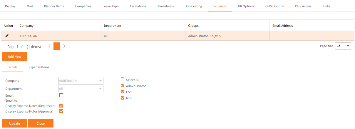 Checking either box will include these notes on expense notification email. - Click Update to Save or Close to discard changes.
