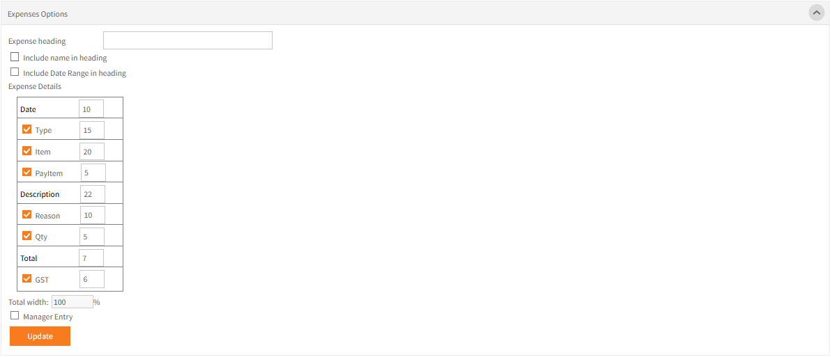 - Set an optional heading for Expenses and whether the employee name and date range should be included.