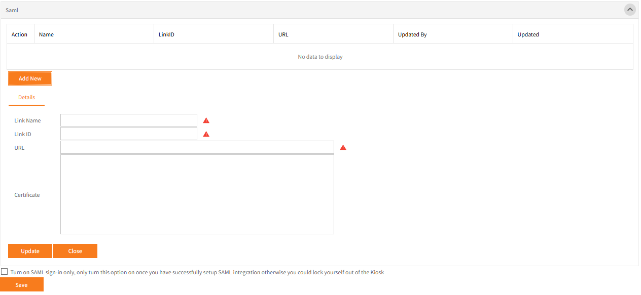 It is possible to then completely switch off the traditional email address and password login to Employee Self-Service Kiosk and only allow SAML sign in by selecting the checkbox at the bottom of the page.