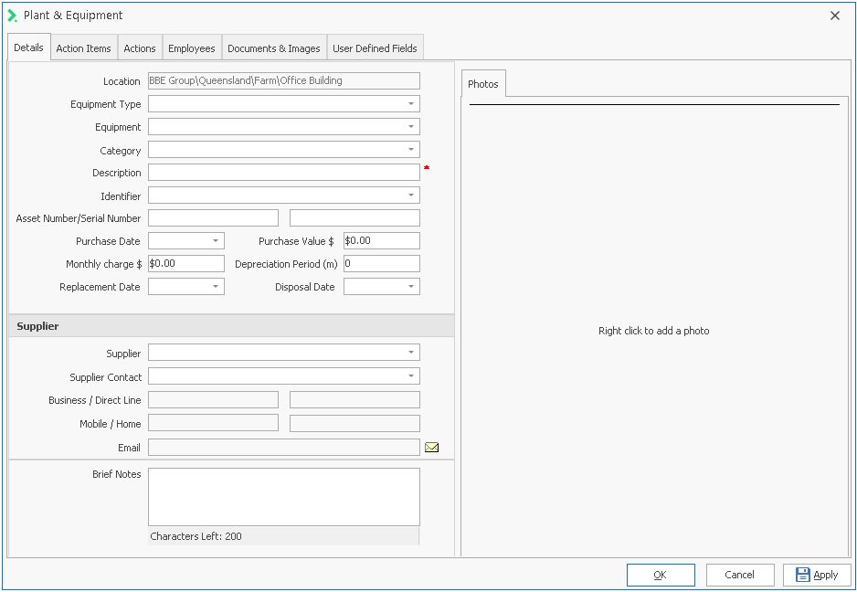 If there are existing Plant and Equipment entries and you wish to view one of them, simply double click on the entry in the right hand pane.